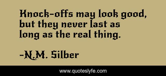 This page presents the quote "Knock-offs may look good, but they never last as long as the real thing.". Author of this quote is N.M. Silber. This quote is about originality, creativity, innovation,.