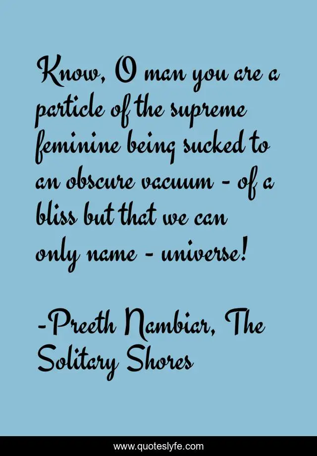 This page presents the quote "Know, O man you are a particle of the supreme feminine being sucked to an obscure vacuum - of a bliss but that we can only name - universe!". Author of this quote is Preeth Nambiar, The Solitary Shores. This quote is about feminine-principle, universe, vacuum,.