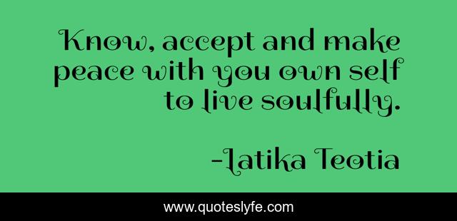 This page presents the quote "Know, accept and make peace with you own self to live soulfully.". Author of this quote is Latika Teotia. This quote is about life, peace, soulful, accept,.