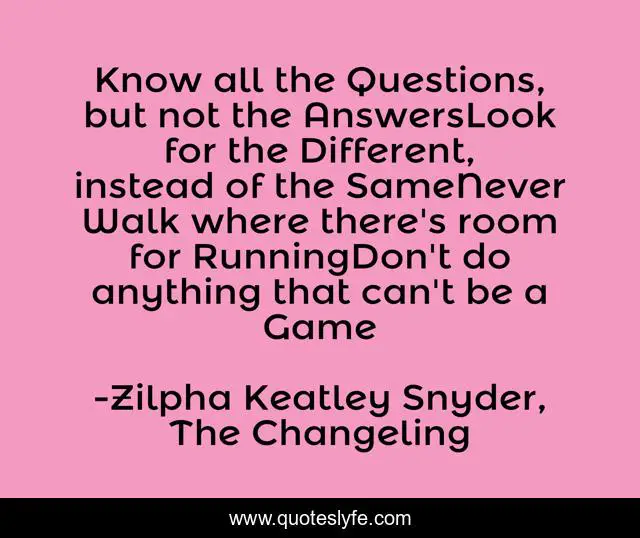 This page presents the quote "Know all the Questions, but not the AnswersLook for the Different, instead of the SameNever Walk where there's room for RunningDon't do anything that can't be a Game". Author of this quote is Zilpha Keatley Snyder, The Changeling. .