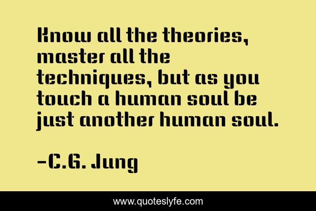 This page presents the quote "Know all the theories, master all the techniques, but as you touch a human soul be just another human soul.". Author of this quote is C.G. Jung. This quote is about interacting, be-yourself, seduction, being-yourself, do-not-try, being-sociable, human-soul,.