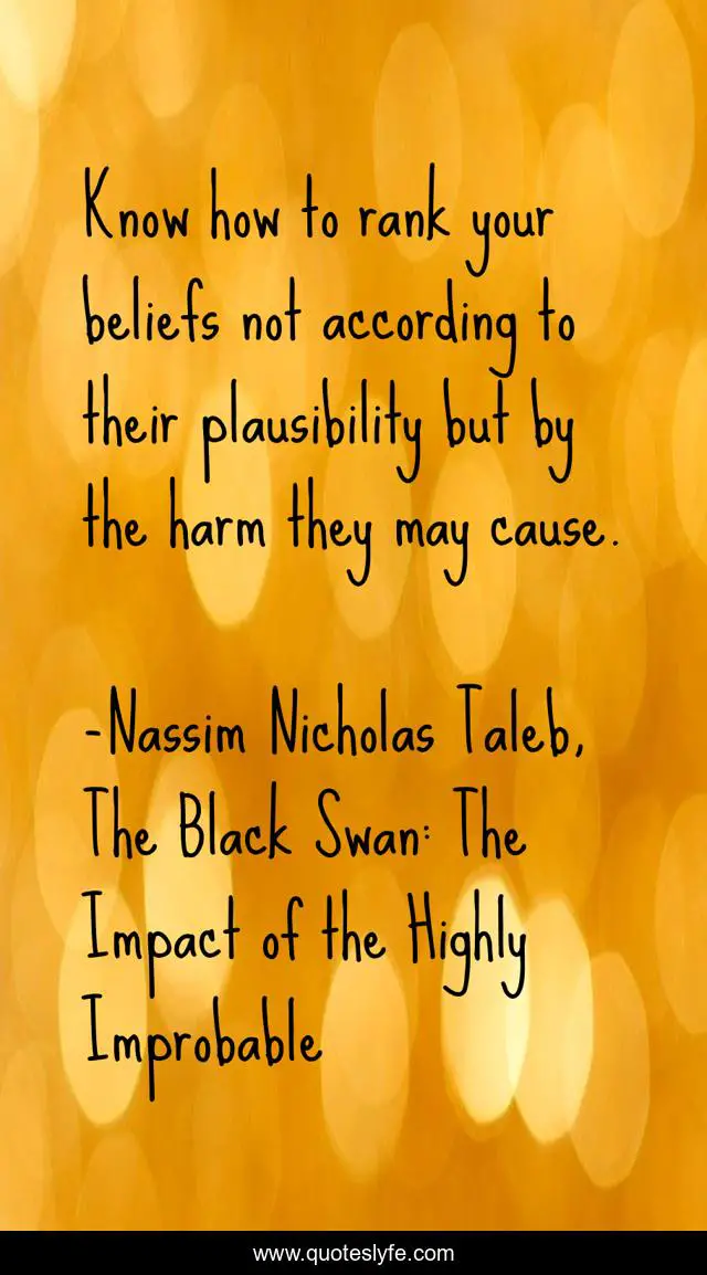 This page presents the quote "Know how to rank your beliefs not according to their plausibility but by the harm they may cause.". Author of this quote is Nassim Nicholas Taleb, The Black Swan: The Impact of the Highly Improbable. This quote is about harm, beliefs, plausibility,.
