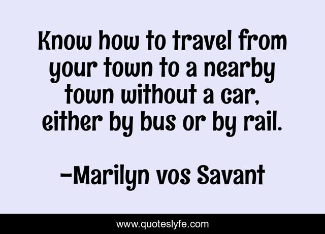 This page presents the quote "Know how to travel from your town to a nearby town without a car, either by bus or by rail.". Author of this quote is Marilyn vos Savant. This quote is about car, without,.