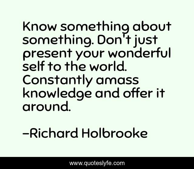 This page presents the quote "Know something about something. Don't just present your wonderful self to the world. Constantly amass knowledge and offer it around.". Author of this quote is Richard Holbrooke. This quote is about enthusiasm, knowledge, inspirational,.