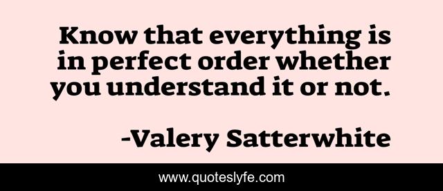 This page presents the quote "Know that everything is in perfect order whether you understand it or not.". Author of this quote is Valery Satterwhite. This quote is about letting-go, acceptance, expectations,.