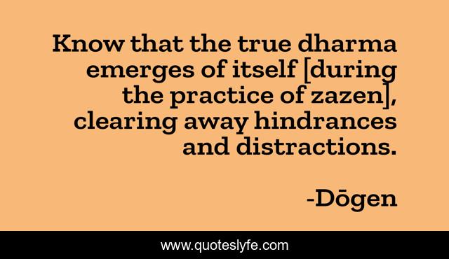 This page presents the quote "Know that the true dharma emerges of itself [during the practice of zazen], clearing away hindrances and distractions.". Author of this quote is Dōgen. .