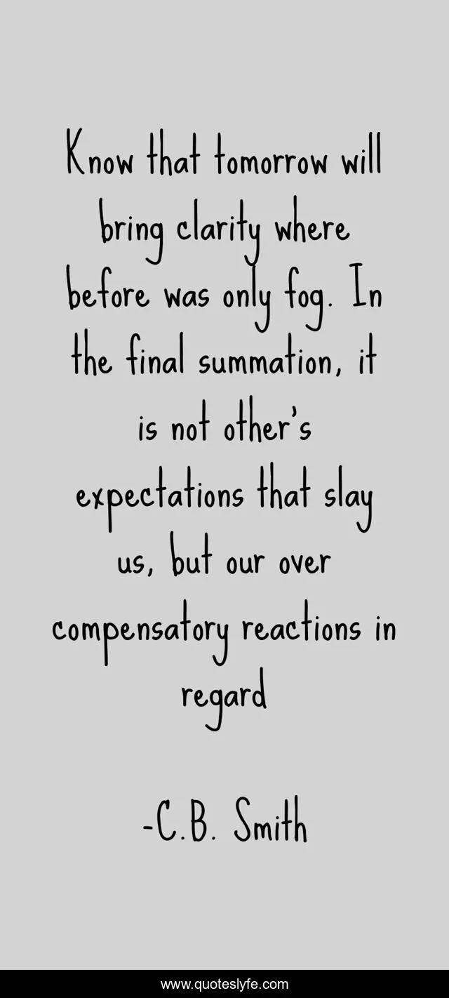 This page presents the quote "Know that tomorrow will bring clarity where before was only fog. In the final summation, it is not other's expectations that slay us, but our over compensatory reactions in regard". Author of this quote is C.B. Smith. This quote is about failure, life, inspirational, enthusiasm,.