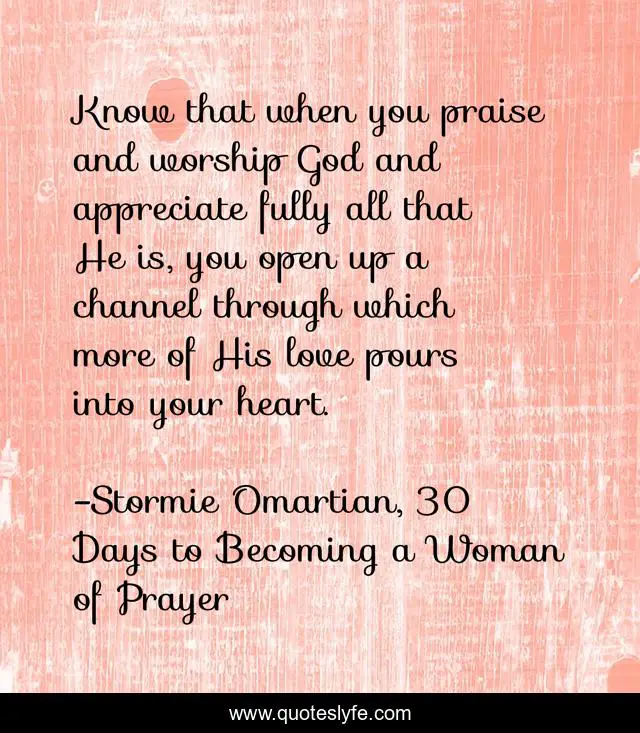 This page presents the quote "Know that when you praise and worship God and appreciate fully all that He is, you open up a channel through which more of His love pours into your heart.". Author of this quote is Stormie Omartian, 30 Days to Becoming a Woman of Prayer. This quote is about love, praise, prayer, worship, affection, women,.