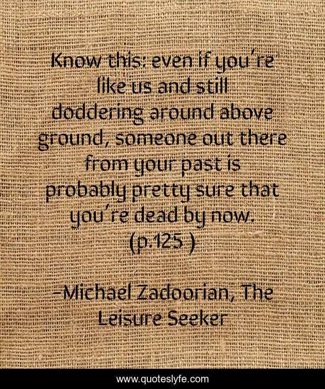 This page presents the quote "Know this: even if you’re like us and still doddering around above ground, someone out there from your past is probably pretty sure that you’re dead by now. (p.125 )". Author of this quote is Michael Zadoorian, The Leisure Seeker. This quote is about aging, end-of-life,.