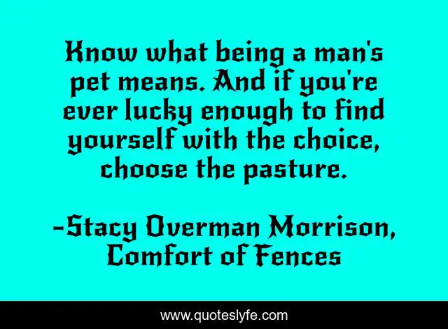 This page presents the quote "Know what being a man's pet means. And if you're ever lucky enough to find yourself with the choice, choose the pasture.". Author of this quote is Stacy Overman Morrison, Comfort of Fences. This quote is about family-relationships, women-s-fiction,.