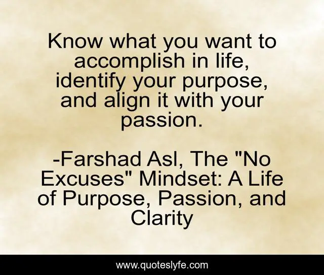 This page presents the quote "Know what you want to accomplish in life, identify your purpose, and align it with your passion.". Author of this quote is Farshad Asl, The "No Excuses" Mindset: A Life of Purpose, Passion, and Clarity. This quote is about life, accomplishments, passion, purpose,.