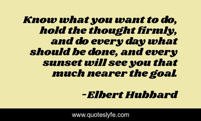 This page presents the quote "Know what you want to do, hold the thought firmly, and do every day what should be done, and every sunset will see you that much nearer the goal.". Author of this quote is Elbert Hubbard. This quote is about life, sunset, goals, dreams,.