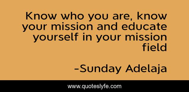 This page presents the quote "Know who you are, know your mission and educate yourself in your mission field". Author of this quote is Sunday Adelaja. This quote is about educate, knowledge, self-education, ignorance, mission, field, purpose, education,.