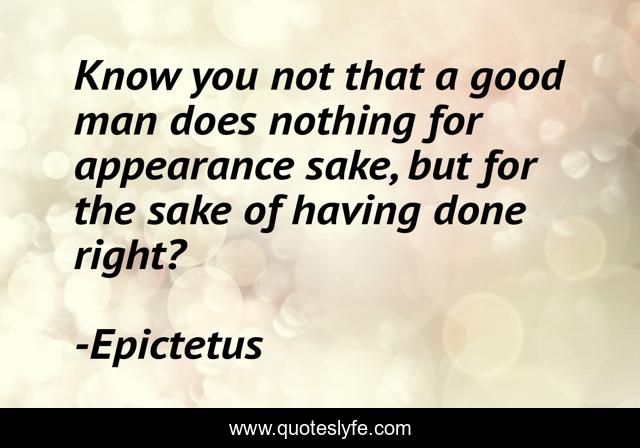 This page presents the quote "Know you not that a good man does nothing for appearance sake, but for the sake of having done right?". Author of this quote is Epictetus. This quote is about epictetus, philosophy, wisdom, virtue, goodness, good-deeds,.
