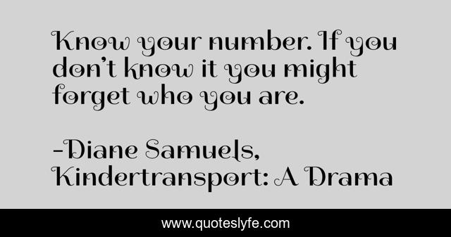 This page presents the quote "Know your number. If you don’t know it you might forget who you are.". Author of this quote is Diane Samuels, Kindertransport: A Drama. This quote is about horror, society-problem, identity-politics, indivuality, humanity,.