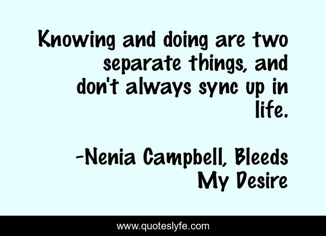 This page presents the quote "Knowing and doing are two separate things, and don't always sync up in life.". Author of this quote is Nenia Campbell, Bleeds My Desire. This quote is about knowing, life, life-and-living, life-lessons, actions,.