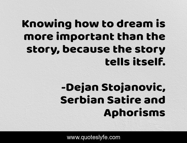 This page presents the quote "Knowing how to dream is more important than the story, because the story tells itself.". Author of this quote is Dejan Stojanovic, Serbian Satire and Aphorisms. This quote is about dejan-stojanovic, story, stories, dreaming,.