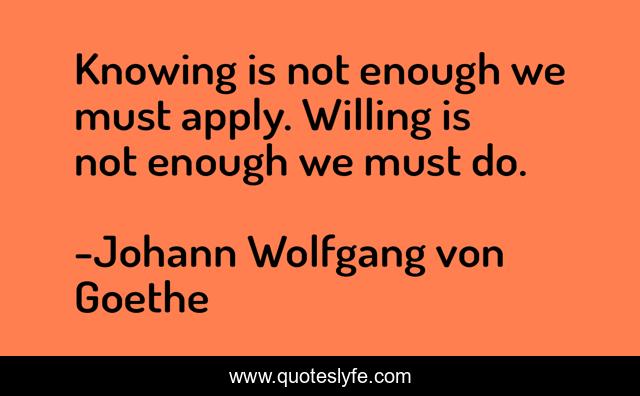 This page presents the quote "Knowing is not enough we must apply. Willing is not enough we must do.". Author of this quote is Johann Wolfgang von Goethe. This quote is about knowing, apply, enough,.