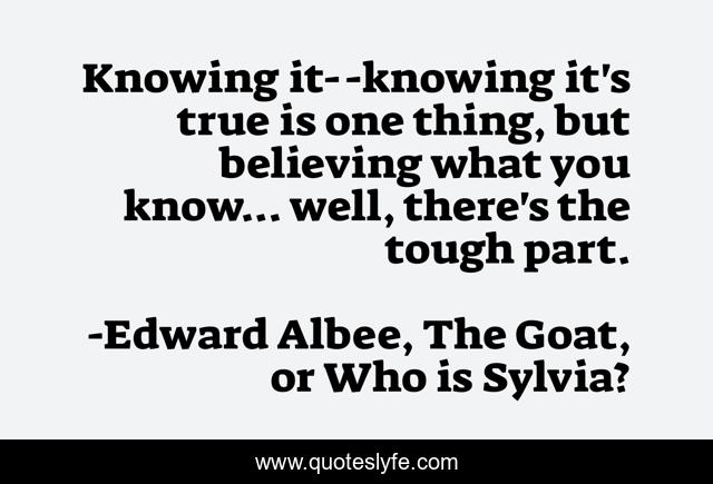 This page presents the quote "Knowing it--knowing it's true is one thing, but believing what you know... well, there's the tough part.". Author of this quote is Edward Albee, The Goat, or Who is Sylvia?. This quote is about drama, play, the-goat-or-who-is-sylvia,.