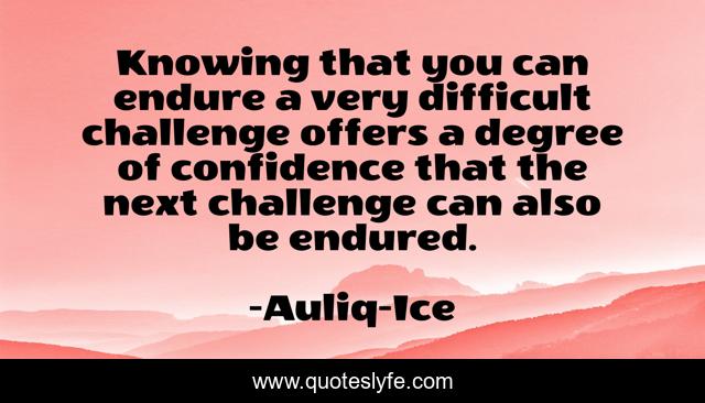 This page presents the quote "Knowing that you can endure a very difficult challenge offers a degree of confidence that the next challenge can also be endured.". Author of this quote is Auliq-Ice. This quote is about confidence, positive, motivational, encouragement, courage, optimistic, inspirational, enthusiasm, happiness,.