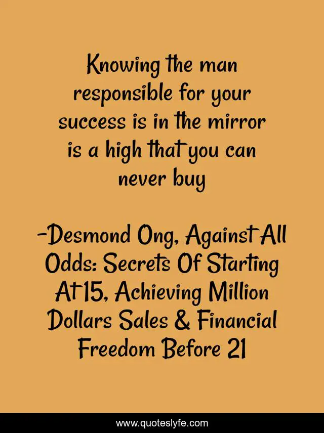 This page presents the quote "Knowing the man responsible for your success is in the mirror is a high that you can never buy". Author of this quote is Desmond Ong, Against All Odds: Secrets Of Starting At 15, Achieving Million Dollars Sales & Financial Freedom Before 21. This quote is about empowerment, business, life, improvement, quotes, inspirational, self-help, enthusiasm,.