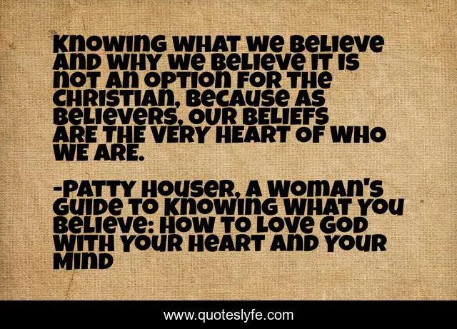 "Patty Houser, A Woman's Guide to Knowing What You Believe: How to Love God With Your Heart and Your Mind Quotes." Quoteslyfe.com, 2025. Sun. 07 Dec. 2025. <https://www.quoteslyfe.com/quote/Knowing-what-we-believe-and-why-we-62359>.