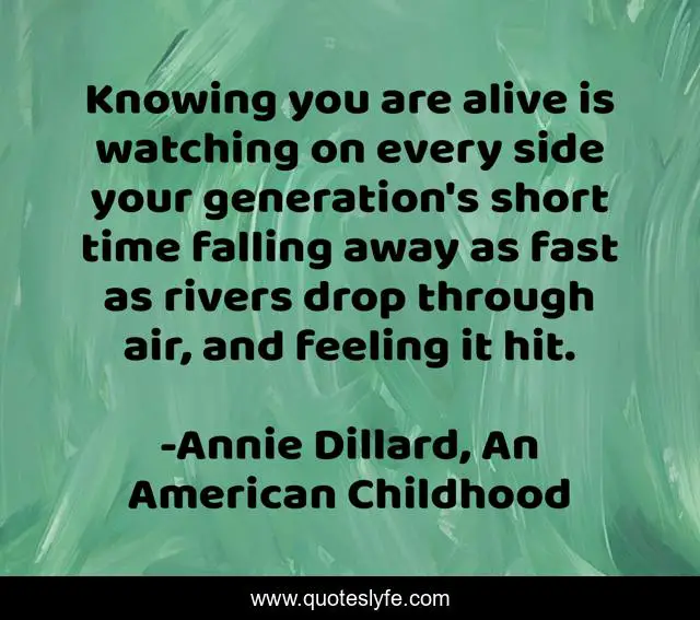 This page presents the quote "Knowing you are alive is watching on every side your generation's short time falling away as fast as rivers drop through air, and feeling it hit.". Author of this quote is Annie Dillard, An American Childhood. This quote is about passage, life, death, awareness, time,.