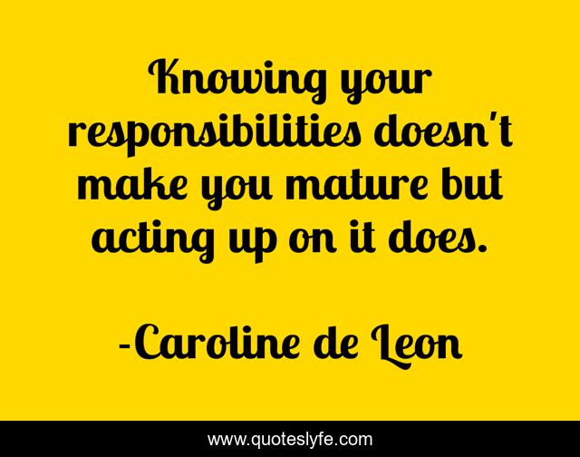This page presents the quote "Knowing your responsibilities doesn't make you mature but acting up on it does.". Author of this quote is Caroline de Leon. This quote is about maturity, responsibilities, priorities,.