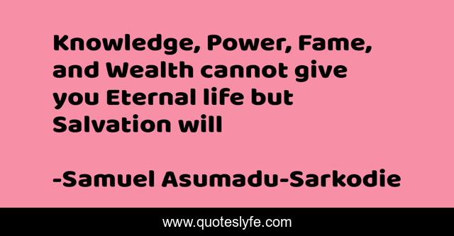 This page presents the quote "Knowledge, Power, Fame, and Wealth cannot give you Eternal life but Salvation will". Author of this quote is Samuel Asumadu-Sarkodie. This quote is about proverbs, words-of-knowledge, discernment, parables, words-of-wisdom, inspiration,.