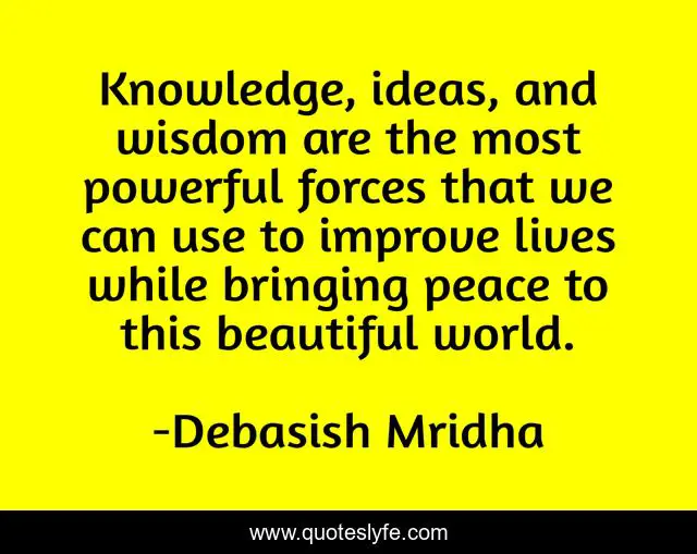 This page presents the quote "Knowledge, ideas, and wisdom are the most powerful forces that we can use to improve lives while bringing peace to this beautiful world.". Author of this quote is Debasish Mridha. This quote is about improve-lives, knowledge, philosophy, debasish-mridha, ideas, wisdom, quotes, debasish-mridha-md, inspirational,.