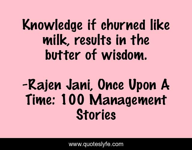 This page presents the quote "Knowledge if churned like milk, results in the butter of wisdom.". Author of this quote is Rajen Jani, Once Upon A Time: 100 Management Stories. This quote is about motivation, communication, sales, anger, improvement, quality, management, knowledge, strategy,.