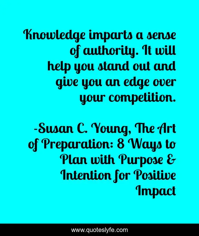 "Susan C. Young, The Art of Preparation: 8 Ways to Plan with Purpose & Intention for Positive Impact Quotes." Quoteslyfe.com, 2025. Fri. 05 Dec. 2025. <https://www.quoteslyfe.com/quote/Knowledge-imparts-a-sense-of-authority-It-227491>.