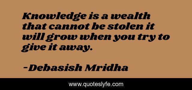 This page presents the quote "Knowledge is a wealth that cannot be stolen it will grow when you try to give it away.". Author of this quote is Debasish Mridha. This quote is about knowledge, mridha, philosophy, quotes, inspirational, enthusiasm, debasish-mridha-m-d, wealth,.