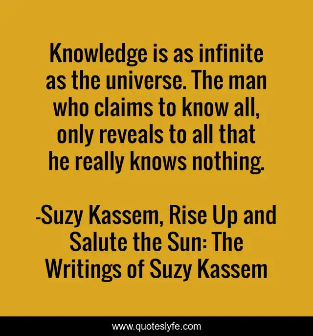 This page presents the quote "Knowledge is as infinite as the universe. The man who claims to know all, only reveals to all that he really knows nothing.". Author of this quote is Suzy Kassem, Rise Up and Salute the Sun: The Writings of Suzy Kassem. This quote is about knowing, knowledge-wisdom, universe, wisdom, ego, arrogance, egotism, arrogant,.