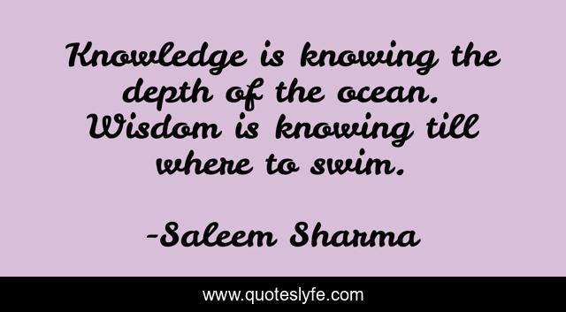 This page presents the quote "Knowledge is knowing the depth of the ocean. Wisdom is knowing till where to swim.". Author of this quote is Saleem Sharma. This quote is about life, ocean, knowledge, experience, wisdom,.