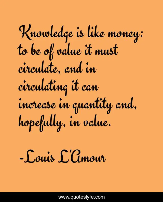 This page presents the quote "Knowledge is like money: to be of value it must circulate, and in circulating it can increase in quantity and, hopefully, in value.". Author of this quote is Louis L'Amour. This quote is about money, value, quantity,.