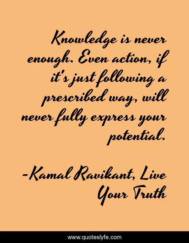 This page presents the quote "Knowledge is never enough. Even action, if it's just following a prescribed way, will never fully express your potential.". Author of this quote is Kamal Ravikant, Live Your Truth. This quote is about knowledge, improvement, intent, self-improvement, action, inspiration,.