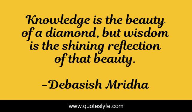 This page presents the quote "Knowledge is the beauty of a diamond, but wisdom is the shining reflection of that beauty.". Author of this quote is Debasish Mridha. This quote is about knowledge, beauty, philosophy, debasish-mridha, wisdom, reflection-of-beauty, quotes, inspirational, enthusiasm,.