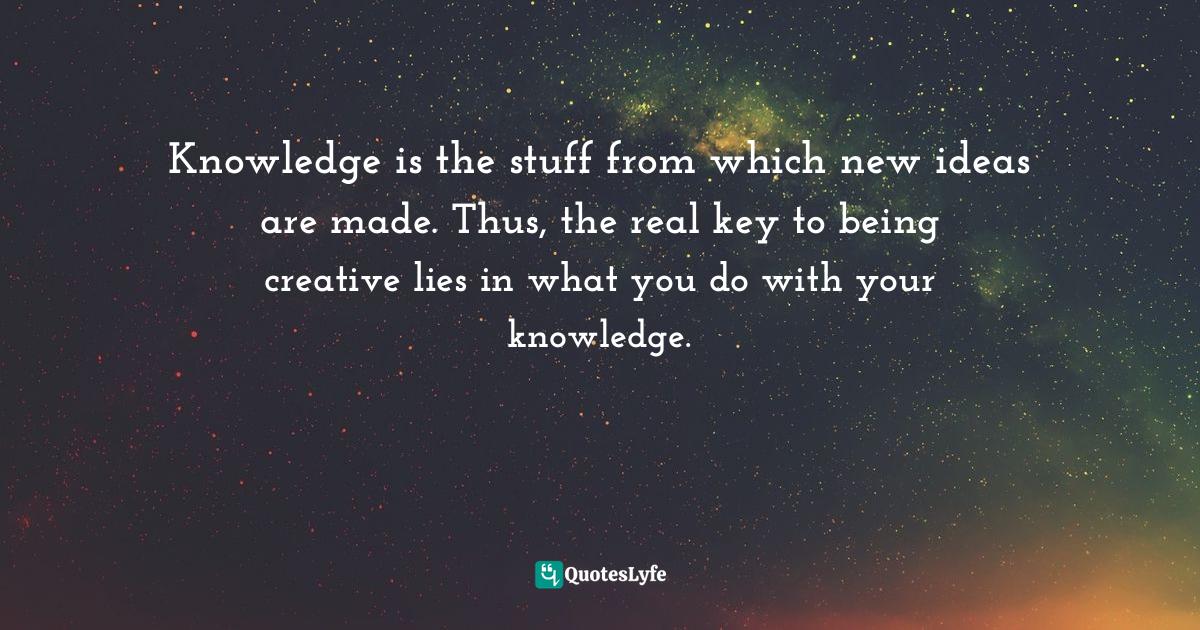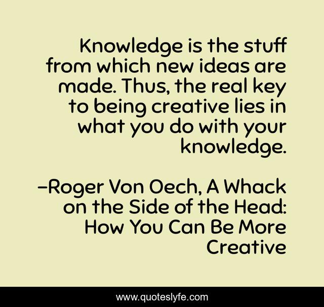 This page presents the quote "Knowledge is the stuff from which new ideas are made. Thus, the real key to being creative lies in what you do with your knowledge.". Author of this quote is Roger Von Oech, A Whack on the Side of the Head: How You Can Be More Creative. This quote is about knowledge, ideas, creative, key, answer, think,.