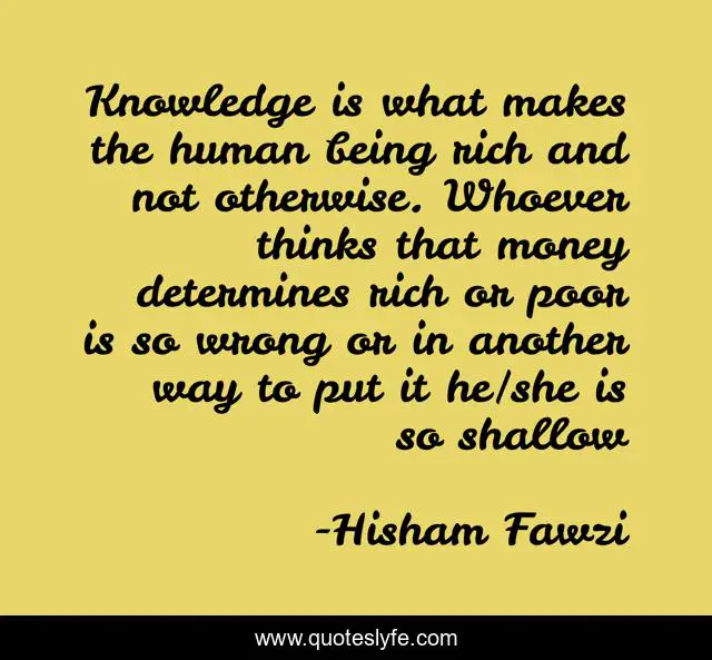 This page presents the quote "Knowledge is what makes the human being rich and not otherwise. Whoever thinks that money determines rich or poor is so wrong or in another way to put it he/she is so shallow". Author of this quote is Hisham Fawzi. This quote is about money, life, knowledge, wisdom,.