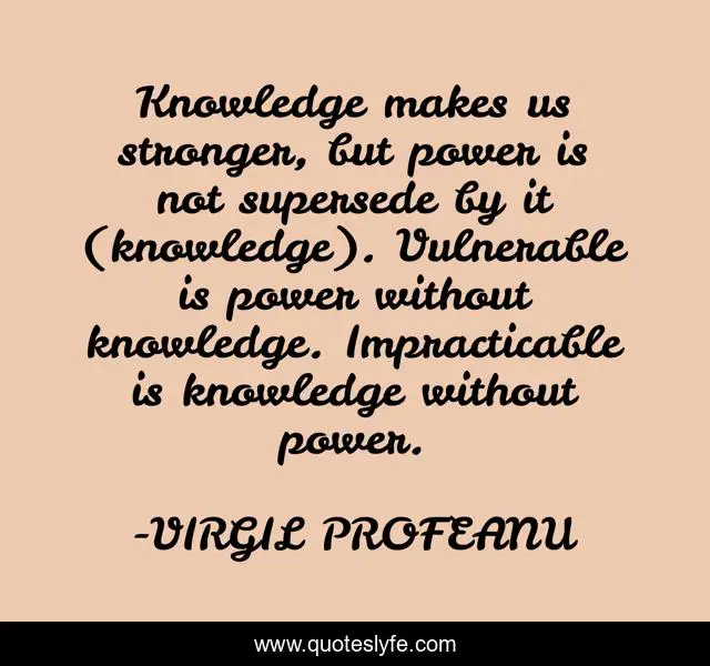 This page presents the quote "Knowledge makes us stronger, but power is not supersede by it (knowledge). Vulnerable is power without knowledge. Impracticable is knowledge without power.". Author of this quote is VIRGIL PROFEANU. .