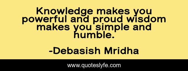 This page presents the quote "Knowledge makes you powerful and proud wisdom makes you simple and humble.". Author of this quote is Debasish Mridha. This quote is about miraboli, knowledge, oscar-wilde, philosophy, debasish-mridha, tagore, wisdom, quotes, buddha,.