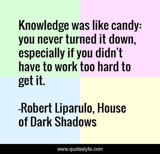 This page presents the quote "Knowledge was like candy: you never turned it down, especially if you didn't have to work too hard to get it.". Author of this quote is Robert Liparulo, House of Dark Shadows. This quote is about knowledge, candy,.