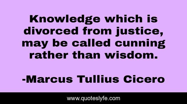 This page presents the quote "Knowledge which is divorced from justice, may be called cunning rather than wisdom.". Author of this quote is Marcus Tullius Cicero. This quote is about justice, divorced, wisdom,.