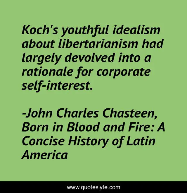"John Charles Chasteen, Born in Blood and Fire: A Concise History of Latin America Quotes." Quoteslyfe.com, 2025. Sat. 06 Dec. 2025. <https://www.quoteslyfe.com/quote/Koch-s-youthful-idealism-about-libertarianism-had-178154>.