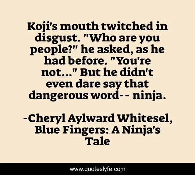 This page presents the quote "Koji's mouth twitched in disgust. "Who are you people?" he asked, as he had before. "You're not..." But he didn't even dare say that dangerous word-- ninja.". Author of this quote is Cheryl Aylward Whitesel, Blue Fingers: A Ninja's Tale. .