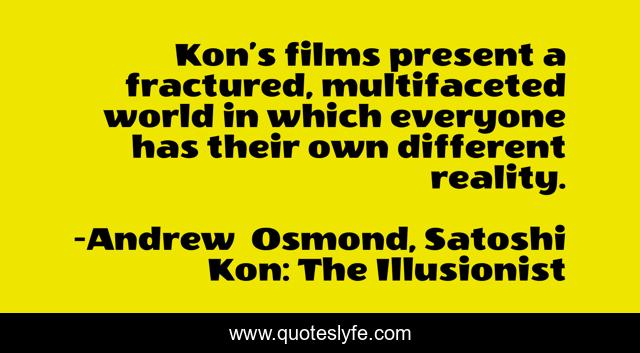 "Andrew Osmond, Satoshi Kon: The Illusionist Quotes." Quoteslyfe.com, 2025. Mon. 08 Dec. 2025. <https://www.quoteslyfe.com/quote/Kon-s-films-present-a-fractured-multifaceted-253893>.