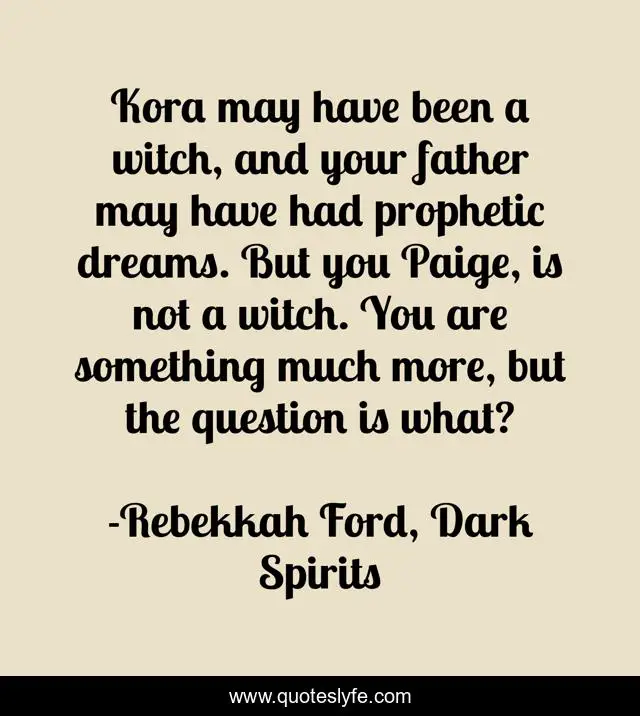 This page presents the quote "Kora may have been a witch, and your father may have had prophetic dreams. But you Paige, is not a witch. You are something much more, but the question is what?". Author of this quote is Rebekkah Ford, Dark Spirits. This quote is about young-adult, paranormal-series,.