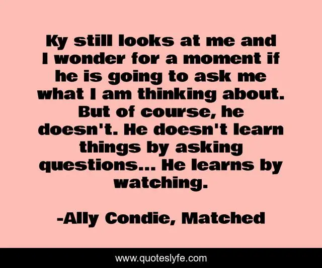 This page presents the quote "Ky still looks at me and I wonder for a moment if he is going to ask me what I am thinking about. But of course, he doesn't. He doesn't learn things by asking questions... He learns by watching.". Author of this quote is Ally Condie, Matched. This quote is about ky, questions, watching,.