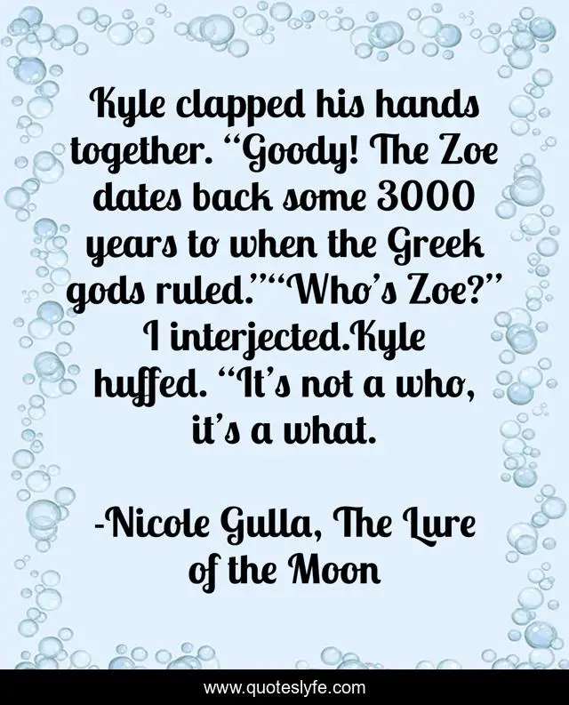 This page presents the quote "Kyle clapped his hands together. “Goody! The Zoe dates back some 3000 years to when the Greek gods ruled.”“Who’s Zoe?” I interjected.Kyle huffed. “It’s not a who, it’s a what.". Author of this quote is Nicole Gulla, The Lure of the Moon. This quote is about trilogy, humor, romance-novels,.